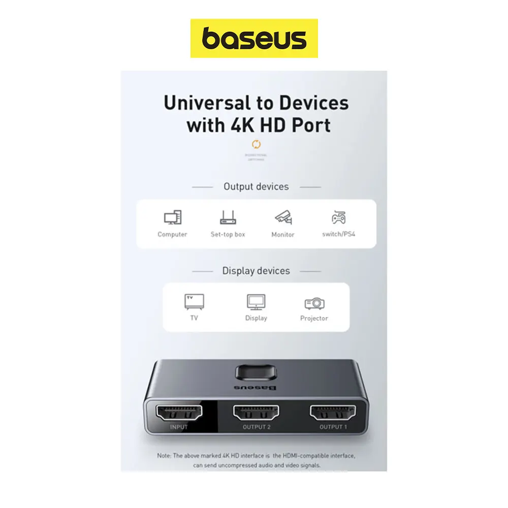 ✅ Adaptador Conmutador BASEUS Matrix HDMI Splitter (2en1 o 1en2) ✅ Divisor 1 en 2 o 2 en 1 – 4K HD, interruptor de dos vías ✅ Dos modos con salida 1 en 2 (un dispositivo está conectado a dos pantallas) y salida 2 en 1 (dos dispositivos están conectados a una pantalla) ✅ Dispositivos de visualización: TV, pantalla, proyectista ✅ Dispositivos de salida: ordenador, decodificador, monitor, interruptor / PS5 ✅ Resolución: 4K @ 30Hz (dependiendo del dispositivo y la longitud del cable) ✅ Transmisión de audio y vídeo sincrónica ✅ No requiere alimentación externa ✅ Plug & Play, Facil de instalar