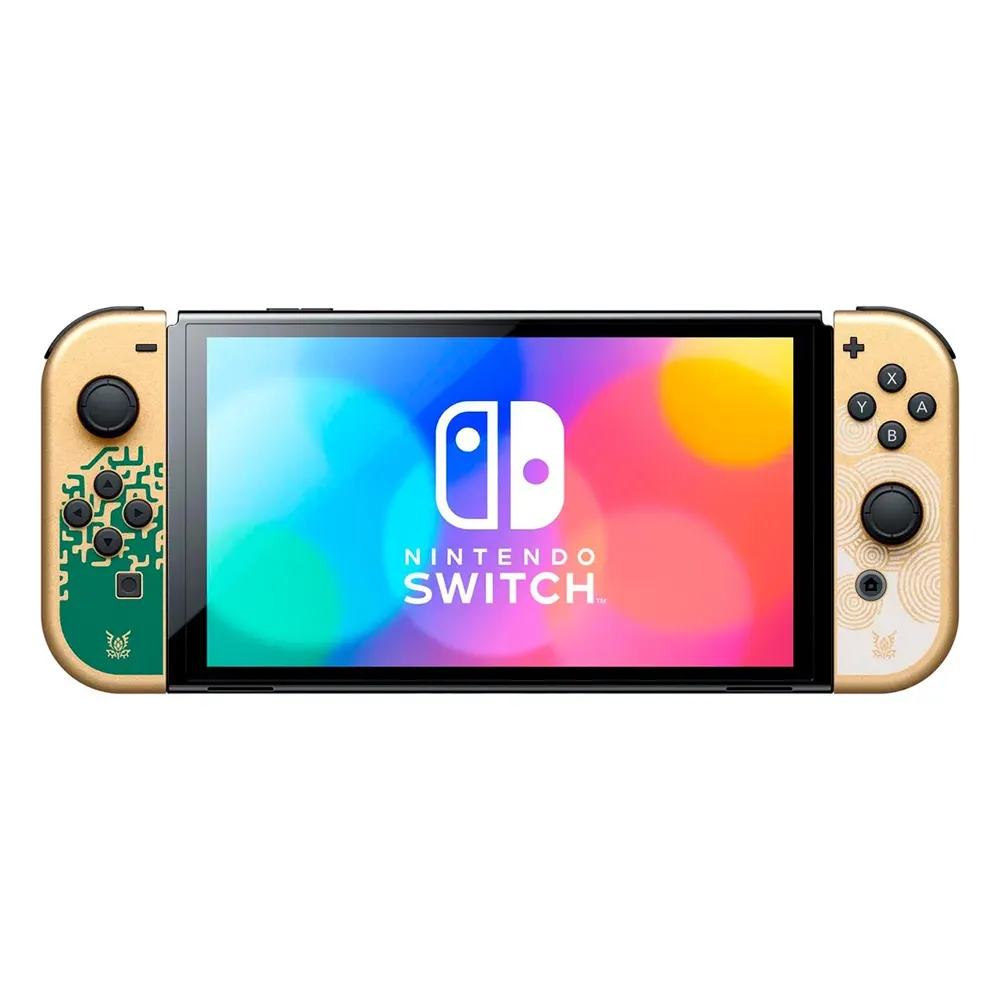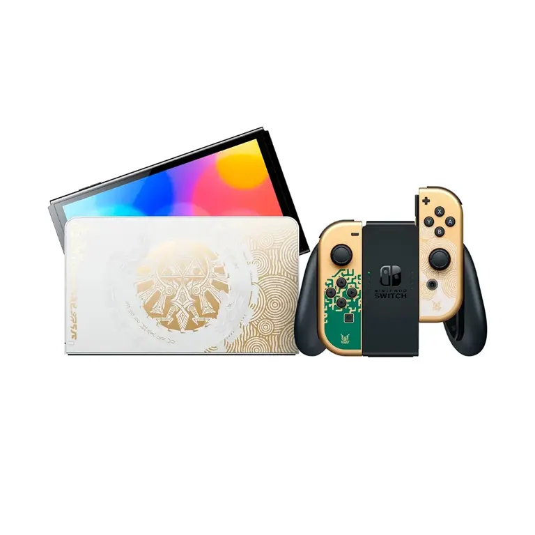 La consola Nintendo Switch Modelo OLED Edición The Legend of Zelda: Tears of the Kingdom presenta un diseño inspirado en el juego Legend of Zelda: Tears of the Kingdom, que incluye el familiar Hylian Crest de la serie Legend of Zelda en el frente del muelle (juego no incluido).