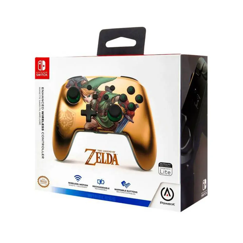 Mando Pro PowerA Nintendo Switch Zelda Link Gold Juega tus juegos favoritos de Nintendo Switch * como un profesional con este controlador inalámbrico mejorado PowerA diseño Link en cromo satinado dorado. Libertad inalámbrica Bluetooth Cuenta con controles de movimiento y botones de juego avanzados Diseño de enlace en cromo satinado dorado Diseño ergonómico con diseño de botones estándar LED para número de jugador, asignación de botones y advertencia de batería baja.