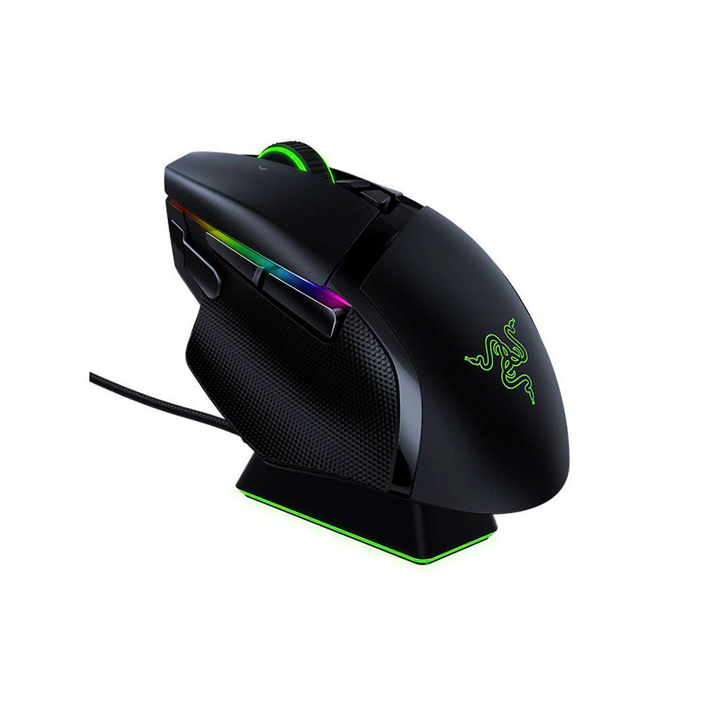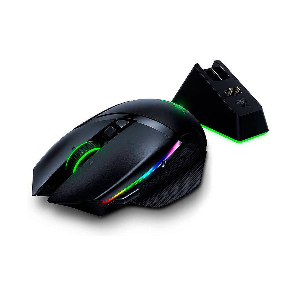 Da rienda suelta a la personalización Con el Razer Basilisk Ultimate, alcanzar la victoria nunca había sido tan personal. Al ser un ratón para juegos inalámbrico de alto rendimiento, en el que puedes personalizar su aspecto, configuración y sensibilidad a tu gusto, los únicos que se quedarán sin opciones serán tus rivales. Tecnología inalámbrica Razer Hyperspeed Al ser un 25 % más rápida que cualquier otra tecnología inalámbrica, ni siquiera te darás cuenta de que no estás usando cables gracias a su transmisión de alta velocidad, su baja latencia de clics y su constante cambio de frecuencia hasta en los entornos más ruidosos y saturados de datos. 11 Botones programables Ten un gran arsenal de comandos al alcance de tus dedos configurando tus macros y funciones secundarias favoritas con Razer Synapse 3. Al igual que su variante con cable, el Razer Basilisk Ultimate incluye su característica gatillo multifunción. 14 Zonas de iluminación Razer chroma programables Cada zona de este ratón inalámbrico se puede configurar de forma individual en Chroma Studio, lo que lo convierte en un añadido que destacará en tu estación de combate al tiempo que aplastas a tus rivales. Resistencia de la rueda de desplazamiento personalizable El Razer Basilisk Ultimate cuenta con un dial en su parte inferior que te permite cambiar la resistencia de la rueda del ratón para que sea tan suave o tan táctil como prefieras. Con este nivel de personalización, podrás realizar saltos, selecciones de armas y otras acciones de la rueda del ratón con mayor precisión.