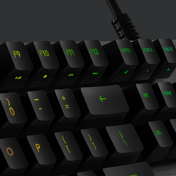 El G513 es un teclado para juegos de alto rendimiento que cuenta con interruptores mecánicos GX Brown Táctiles. Incorpora un reposamanos desmontable hecho de espuma viscoelástica y una estructura de aleación de aluminio de alta calidad, lo que lo convierte en un teclado de primera categoría. El G513 puede personalizarse tecla por tecla con una gama de 16,8 millones de colores. Puedes crear tus propias animaciones o elegir entre varios efectos preestablecidos. Con la tecnología LIGHTSYNC, la iluminación del teclado cambia según el juego, el audio o la pantalla para proporcionar una experiencia RGB altamente envolvente. La espuma viscoelástica del reposamanos recupera rápidamente su forma original, por lo que siempre ofrece la misma comodidad que al principio. Este reposamanos está cubierto con una suave y duradera piel sintética que es resistente al agua, al sudor y fácil de limpiar. Se sostiene firmemente sobre seis patas de goma, asegurando estabilidad durante el uso. Los controles multimedia y de iluminación están al alcance de tus dedos. Usa la tecla FN para ajustar el volumen, reproducir o pausar música, silenciar, activar o desactivar el modo de juego, cambiar efectos de iluminación, entre otras funciones. Con Logitech G HUB, puedes cambiar la función de la tecla FN para que las funciones alternativas se activen de manera predeterminada.