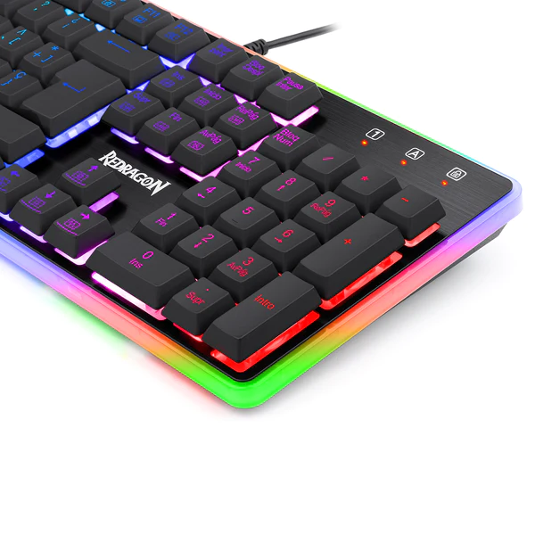 Un teclado ideal para quienes buscan una sensación mecánica con bajo nivel de ruido para uso diario. Utiliza interruptores semimecánicos y cuenta con iluminación RGB con colores sólidos y diversos efectos, además de luces LED en el borde. Está diseñado para el idioma español, con una tecla "Ñ", una tecla "Enter" de tamaño completo y una tecla ">" juntoal Shift. Incluye controles multimedia, controles de iluminación y efectos, y ofrece 100% Anti-Ghosting con 25 teclas sin conflicto. Tiene sistema antisalpicaduras y teclas resistentes al desgaste, hechas con doble inyección. La estructura está construida con aluminio y plástico ABS.