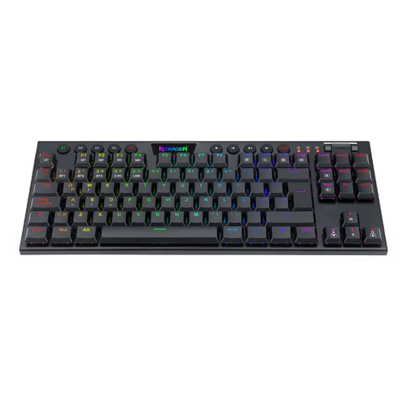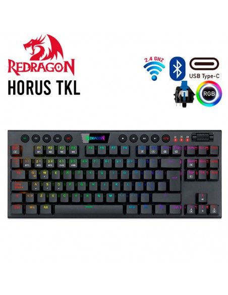 El teclado mecánico HORUS TKL K621-RGB es una opción Tenkeyless (sin teclado numérico) que ofrece dos opciones de conexión: inalámbrica o por cable. Su diseño y disposición están pensados para brindar el máximo rendimiento y confort que se puede esperar de un teclado mecánico competitivo de Redragon. Con una retroiluminación RGB Chroma y una amplia gama de accesos rápidos mediante la tecla Fn, este teclado se convierte en una herramienta poderosa y eficaz. Aunque carece de teclado numérico, el HORUS es compacto, ideal para espacios reducidos, y gracias a la tecla Fn, no sacrificarás funcionalidad, ya que te dará acceso a todas las funciones necesarias para mejorar tu experiencia de juego. Además, está diseñado con distribución en español y cuenta con un software dedicado que permite la personalización para adaptarse a tu estilo de juego. Equipado con un sistema de conexión inalámbrica de 2,4 GHz mediante un dongle nano y tecnología Bluetooth 5.0, este teclado ofrece la flexibilidad de ser utilizado en cualquier lugar con total comodidad. También incluye un cable USB Type-C desmontable para cambiar al modo cableado en cualquier momento. Con los switches Redragon Red, que son lineales, silenciosos y de perfil ultra bajo, el HORUS ofrece una experiencia de pulsación ágil y precisa. Estos switches están diseñados para resistir hasta 50 millones de clics, son aptos para el cambio rápido (hot swap) y están encapsulados para resistir salpicaduras y polvo, lo que los hace ideales para enfrentarse al enemigo con rapidez y eficacia.