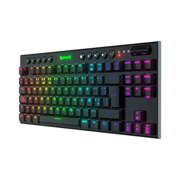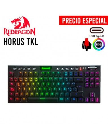 El HORUS TKL K622-RGB es un teclado mecánico sin teclado numérico, ofreciendo dos opciones de conexión: inalámbrica y por cable. Su diseño y disposición están pensados para brindar el mejor desempeño y confort dentro del competitivo mundo de los teclados mecánicos de Redragon. Con iluminación RGB Chroma y una amplia gama de accesos rápidos a través de la tecla Fn, se convierte en una herramienta formidable. Su diseño compacto lo hace ideal para espacios reducidos, sin sacrificar funcionalidad gracias a la tecla Fn que permite acceder a todas las funciones necesarias para mejorar tu experiencia de juego. Además, está disponible con distribución en español y un software dedicado para una personalización completa, garantizando rapidez en cada partida. Equipado con un sistema de conexión inalámbrica de 2,4 GHz mediante un dongle nano y tecnología Bluetooth 5.0, este teclado te brinda libertad de movimiento y flexibilidad para usarlo donde quieras. Además, su cable USB tipo C desmontable permite cambiar al modo cableado fácilmente cuando lo necesites. En resumen, el HORUS TKL K622-RGB ofrece la combinación perfecta entre ergonomía y funcionalidad para mejorar tu experiencia de juego.