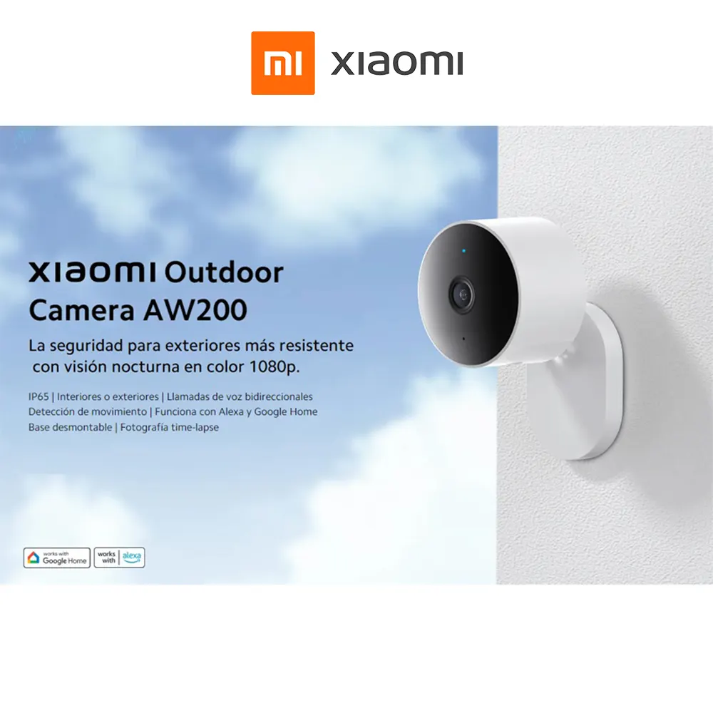 DESCRIPCIÓN Xiaomi Outdoor Camera AW200, Cámara de seguridad IP con Wifi, para uso interior o exterior, resistente a la intemperie con visión nocturna Cámara de seguridad IP – 1080p – Interior/Exterior – Visión nocturna – Resisten al agua IP65 – Audio bidireccional – Detección de movimiento – Compatible con Alexa y Google Home – Base desmontable – Fotografía de lapso de tiempo La cámara de seguridad Xiaomi Outdoor Camera AW200 presenta una alta resolución de 1920x1080p para una gran calidad de imagen, con zoom digital para ampliación de detalles. Funciona con Alexa y Google Home. La cámara se puede vincular a su pantalla inteligente de Alexa o Google para ver imágenes de vigilancia en su dispositivo y se puede encender y apagar con la voz. Visión nocturna a todo color e infrarroja mejorada La gran apertura F1.6 también ayuda a aumentar la entrada de luz y mejora la transparencia de la imagen. Ampliación diurna sin desenfoque y retención de color durante la noche, la visión nocturna a todo color con luz ultra baja le permite ver el color durante el día en condiciones de luz extremadamente bajas. La visión nocturna infrarroja mejorada le permite ver claramente incluso en condiciones de total oscuridad. Sin iluminación de punto rojo visible con LED de 940 nm y visión nocturna activada. Rendimiento mejorado en comparación con los LED de 850 nm. Verdadera visión nocturna infrarroja no intrusiva. Resistencia al agua y al polvo La Xiaomi Outdoor Camera AW200 es resistente al polvo y al agua IP65 y está diseñada con un altavoz, un micrófono y una toma de corriente impermeables profesionales. Colócalo donde quieras sin miedo a los elementos. El tamaño compacto también permite su uso en interiores. Audio bidireccional Llamadas de voz bidireccionales con sonido claro. Hable e interactúe como si estuviera cara a cara con comunicación de audio bidireccional de hasta 5 metros. Reciba notificaciones si se detecta un comportamiento anormal La tecnología de detección humana AI filtra las alarmas no deseadas causadas por movimientos no humanos. Cada vez que se detecta una persona, se envían notificaciones a un teléfono inteligente para garantizar la seguridad Diseño compacto con base desmontable El diseño inteligente y la base flexible la convierten en una verdadera cámara para interiores y exteriores. Fotografía de lapso de tiempo y grabación de sonidos Utilice la cámara para tomar grabaciones de lapso de tiempo de flores floreciendo o de la salida y puesta del sol. Con la función de sonidos personalizados, la cámara reproducirá automáticamente grabaciones de voz personalizadas cuando detecte objetos en movimiento. Almacenamiento en la nube y tarjeta Micro SD La tarjeta Micro SD local y el almacenamiento en la nube le brindan dos soluciones de almacenamiento diferentes. Para garantizar su privacidad y la seguridad de sus datos, la cámara utiliza Mi Security Chip, que tiene una clave privada y un certificado únicos, lo que garantiza una comunicación y un almacenamiento de datos seguros. ¿Cómo conecto la cámara con mi móvil? Fácil instalación en solo 3 pasos: Descargue la aplicación Mi Home/Xiaomi Home en su móvil Encienda la cámara Abra la aplicación y busque dispositivos para conectarse Especificaciones Técnicas Xiaomi Outdoor Camera AW200 Cámara de seguridad IP Wifi: Producto: Xiaomi Outdoor Camera AW200 Modelo: MJSXJ05HL Rentrada nominal: 5V/1A Apertura: F1.6 Codificación de video: H.265 Temperatura de funcionamiento: -20°C a 50° Resolución: 1920×1080 Ángulo de la lente: 120° Conexión inalámbrica: Wi-Fi IEEE 802.11b/g/ n Modo de almacenamiento: tarjeta Micro SD Contenido del paquete: 1 x Xiaomi Outdoor Camera AW200 Cámara de seguridad IP Wifi ****GARANTIA 90 DIAS SOLO POR DEFECTOS DE FABRICA*** ————————————— *Índice de resistencia al agua IP65, diseñada para su uso en entornos semiexteriores, como bajo tejados; no adecuada para su uso bajo el agua o con fuertes lluvias prolongadas. *El adaptador de corriente no está incluido en el paquete; si es necesario, compra el adaptador de corriente de 5 V/1 A. *El cable de extensión del adaptador debe ser resistente al agua en la interfaz del dispositivo para poder utilizarlo. *Las tarjetas microSD no están incluidas en el paquete; el usuario debe adquirirlas. Tras instalar una tarjeta microSD, asegúrate de que la cubierta de la ranura resistente al agua está correctamente colocada antes de utilizarla. *El código QR del dispositivo se encuentra en la base del producto. Antes de realizar el montaje en la pared, te recomendamos escanear el código QR para conectarla a la red. *Para utilizar las funciones de control por voz de Alexa y Google Home, se requieren dispositivos inteligentes de control por voz. Los dispositivos de conexión relacionados se venden por separado. *Google y los logotipos relacionados son marcas comerciales de Google LLC. *Amazon, Alexa y todos los logotipos relacionados son marcas comerciales de Amazon.com, Inc. o sus afiliados. *Google Home y Amazon Alexa no están disponibles en algunos países e idiomas. La disponibilidad de los servicios varía según el país y el idioma. *Google es una marca comercial de Google LLC. *Google Home no está disponible en algunos países e idiomas. Consulta el sitio web oficial para obtener más información. *Alexa no está disponible en todos los países e idiomas. Las funciones y funcionalidades de Alexa pueden variar según la ubicación. Consulta el sitio web oficial para obtener más información.