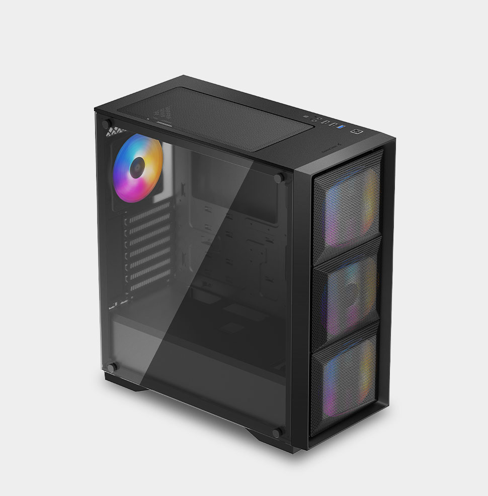 Cuatro ventiladores de 120 mm vienen preinstalados en MATREXX 50 MESH 4FS, tres en la parte delantera y uno en la parte trasera. Los ventiladores se iluminan con una combinación preestablecida de LED tricolor, simplemente enchúfelos y disfrute de la experiencia visual.