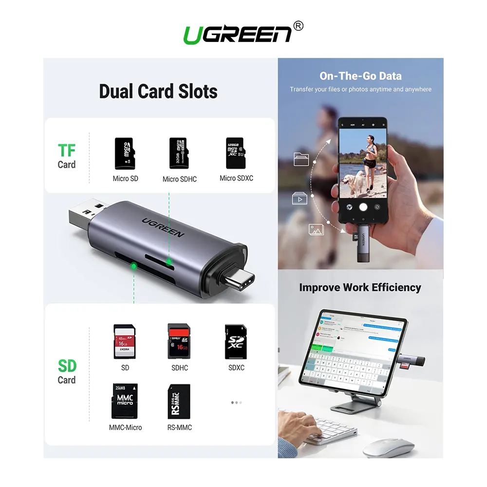 Moderno y portátil: el lector de tarjetas UGREEN hecho de metal resistente al desgaste es una gran idea para llevar, ya sea para la oficina o para viajar