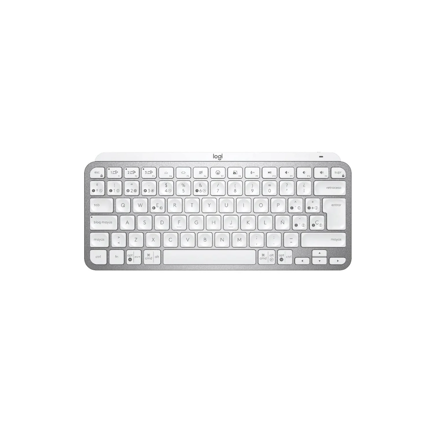 El MX Keys Mini es un teclado compacto diseñado para creadores, que combina un formato reducido con teclas inteligentes para mejorar la productividad. Su diseño minimalista permite un uso más eficiente de cada tecla y atajo, favoreciendo la ergonomía y la postura, ya que permite alinear mejor los hombros y acercar el ratón al teclado, reduciendo así el movimiento de las manos.Las teclas Fn incluyen funciones avanzadas, como el envío de emojis, silenciar o reactivar el micrófono, y activar la función de voz a texto. Estas teclas requieren el software Logi Options+, disponible para Windows® y macOS, para aprovechar todas sus funciones. Además, el teclado cuenta con sensores de proximidad que encienden la retroiluminación cuando detectan las manos y la apagan cuando te alejas para conservar energía. La intensidad de la retroiluminación se ajusta automáticamente a las condiciones de luz del entorno, pero también se puede configurar manualmente.El MX Keys Mini puede funcionar hasta 10 días con una carga completa o hasta 5 meses si la retroiluminación está desactivada. Para recargar, usa el cable USB-C incluido. Este teclado puede emparejarse con hasta tres dispositivos mediante Bluetooth de bajo consumo, sin necesidad de usar puertos USB adicionales.